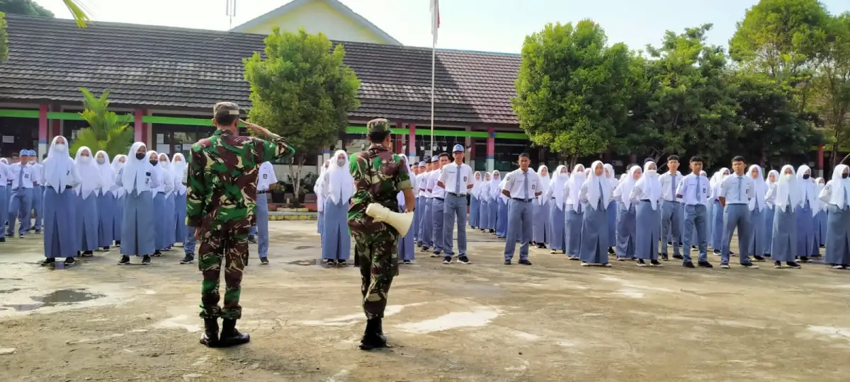 Kegiatan kedisiplinan siswa dan latihan tata upacara di latih oleh Babinsa anggota Koramil Kotaagung